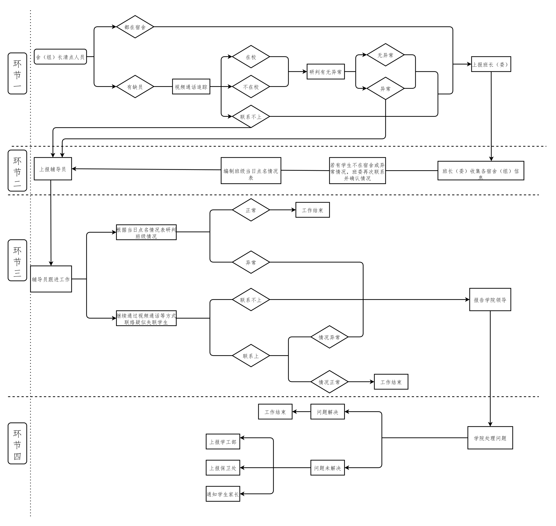 3.本工作流程链分4个环节。环节一的“节长”为宿舍长或宿舍组长,主要负责本宿舍(组)成员归寝情况自查和信息上报工作;环节二的“节长”为班长或相关班委,主要负责全班宿舍归寝信息的统计和制表工作;环节三的“节长”由辅导员兼任,主要负责班级查寝信息表的分析研判和特殊学生追踪工作;环节四的“节长”为学院分管学生工作领导,主要负责危机情况应急处理工作。